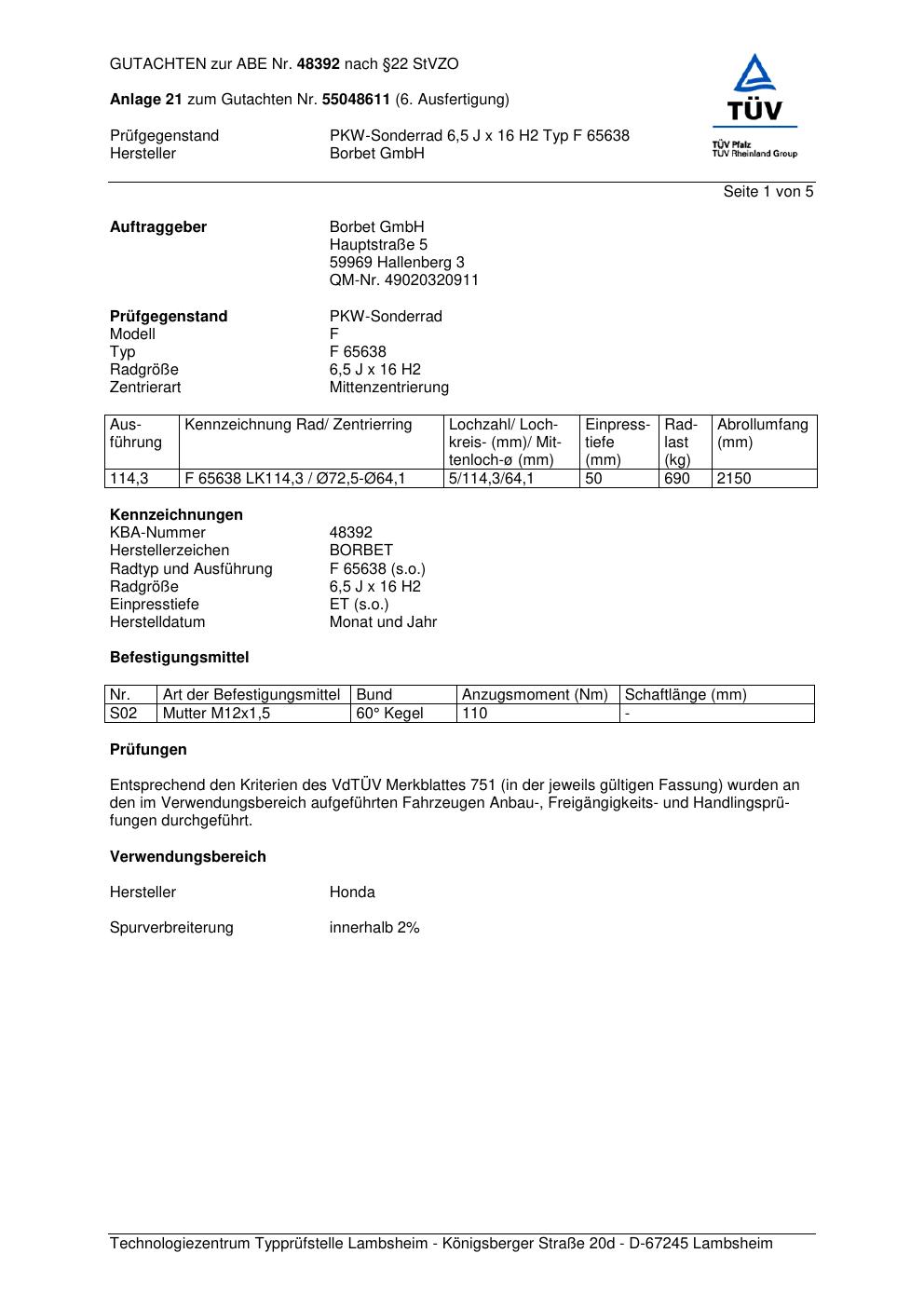 Dieses Gutachten (abe) bezieht sich auf die Alufelge Borbet F 65 638 in der Ausführung 6.5Jx16 ET 0, Mittenloch 0 mm (KBA 48392). Im PDF findest du typischerweise zulässige Reifengrößen, Auflagen/Anbauhinweise und – je nach Dokument – Hinweise zur Eintragung.
