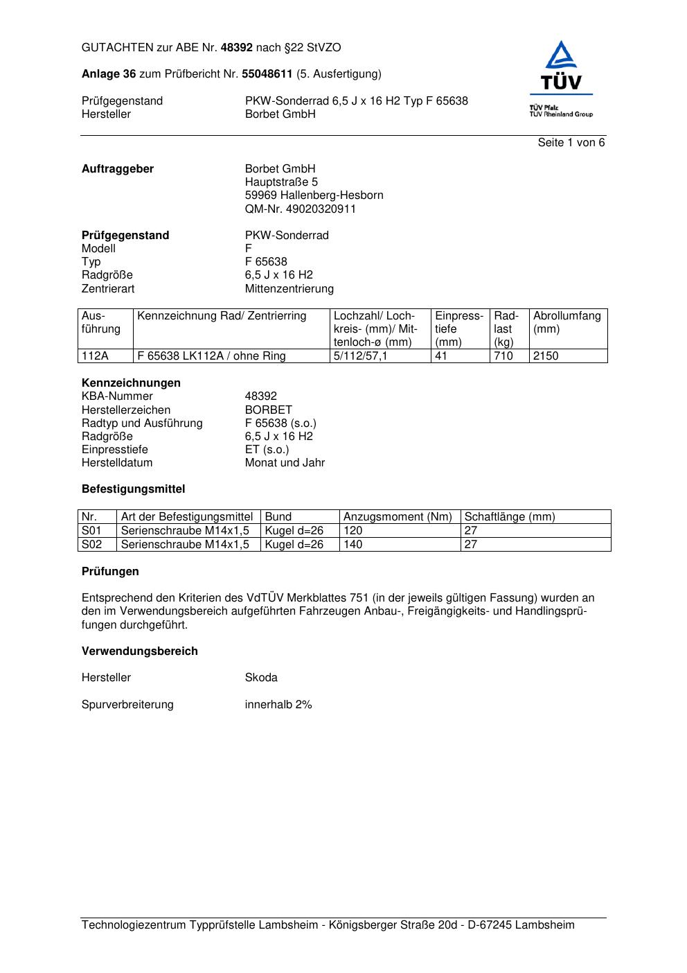 Dieses Gutachten (abe) bezieht sich auf die Alufelge Borbet F 65 638 in der Ausführung 6.5Jx16 ET 0, Mittenloch 0 mm (KBA 48392). Im PDF findest du typischerweise zulässige Reifengrößen, Auflagen/Anbauhinweise und – je nach Dokument – Hinweise zur Eintragung.