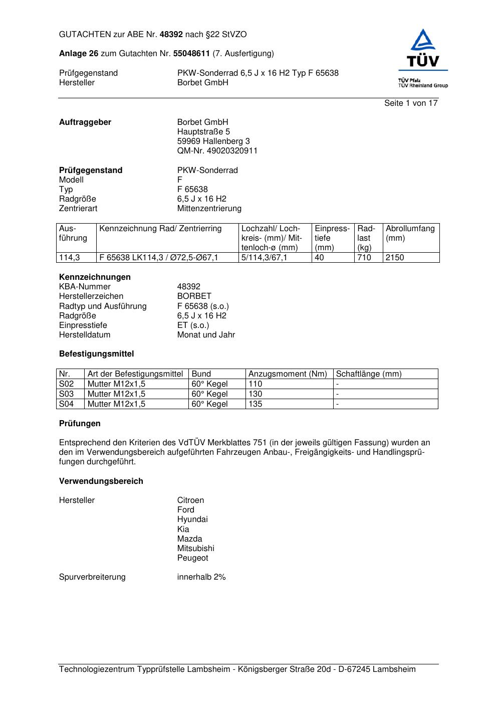 Dieses Gutachten (abe) bezieht sich auf die Alufelge Borbet F 65 638 in der Ausführung 6.5Jx16 ET 0, Mittenloch 0 mm (KBA 48392). Im PDF findest du typischerweise zulässige Reifengrößen, Auflagen/Anbauhinweise und – je nach Dokument – Hinweise zur Eintragung.