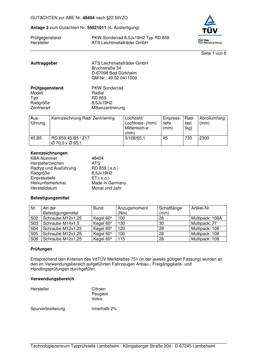 Dieses Gutachten (abe) bezieht sich auf die Alufelge ATS RD 859 in der Ausführung 8.5Jx19 ET 0, Mittenloch 0 mm (KBA 48404). Im PDF findest du typischerweise zulässige Reifengrößen, Auflagen/Anbauhinweise und – je nach Dokument – Hinweise zur Eintragung.