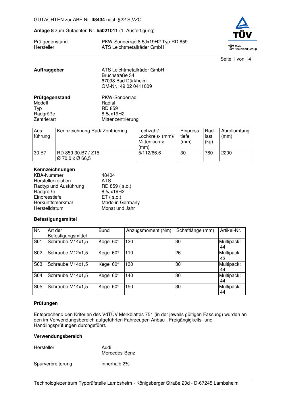 Dieses Gutachten (abe) bezieht sich auf die Alufelge ATS RD 859 in der Ausführung 8.5Jx19 ET 0, Mittenloch 0 mm (KBA 48404). Im PDF findest du typischerweise zulässige Reifengrößen, Auflagen/Anbauhinweise und – je nach Dokument – Hinweise zur Eintragung.