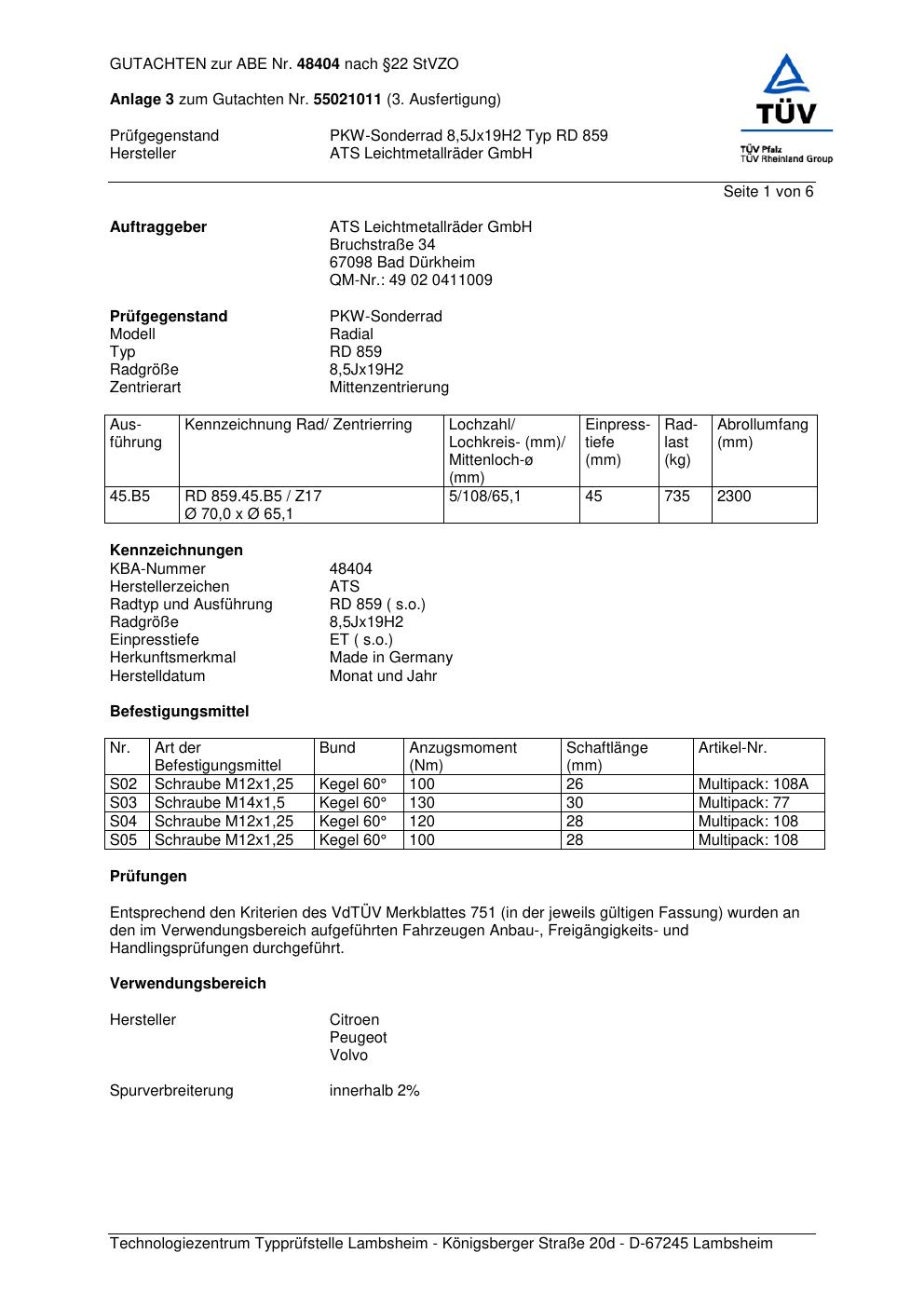 Dieses Gutachten (abe) bezieht sich auf die Alufelge ATS RD 859 in der Ausführung 8.5Jx19 ET 0, Mittenloch 0 mm (KBA 48404). Im PDF findest du typischerweise zulässige Reifengrößen, Auflagen/Anbauhinweise und – je nach Dokument – Hinweise zur Eintragung.