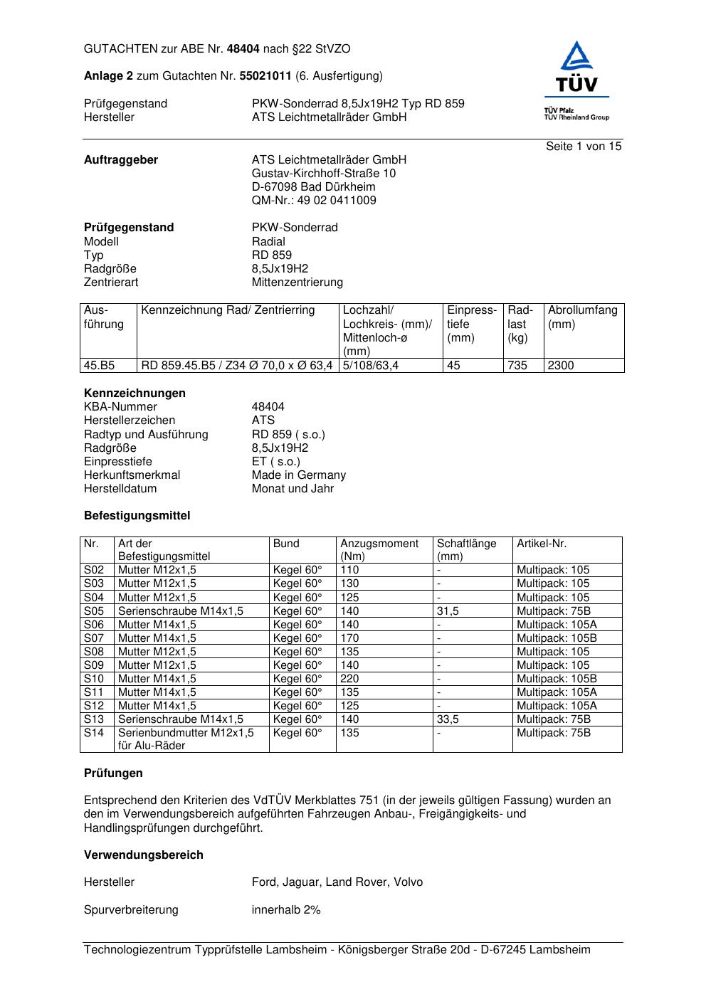 Dieses Gutachten (abe) bezieht sich auf die Alufelge ATS RD 859 in der Ausführung 8.5Jx19 ET 0, Mittenloch 0 mm (KBA 48404). Im PDF findest du typischerweise zulässige Reifengrößen, Auflagen/Anbauhinweise und – je nach Dokument – Hinweise zur Eintragung.