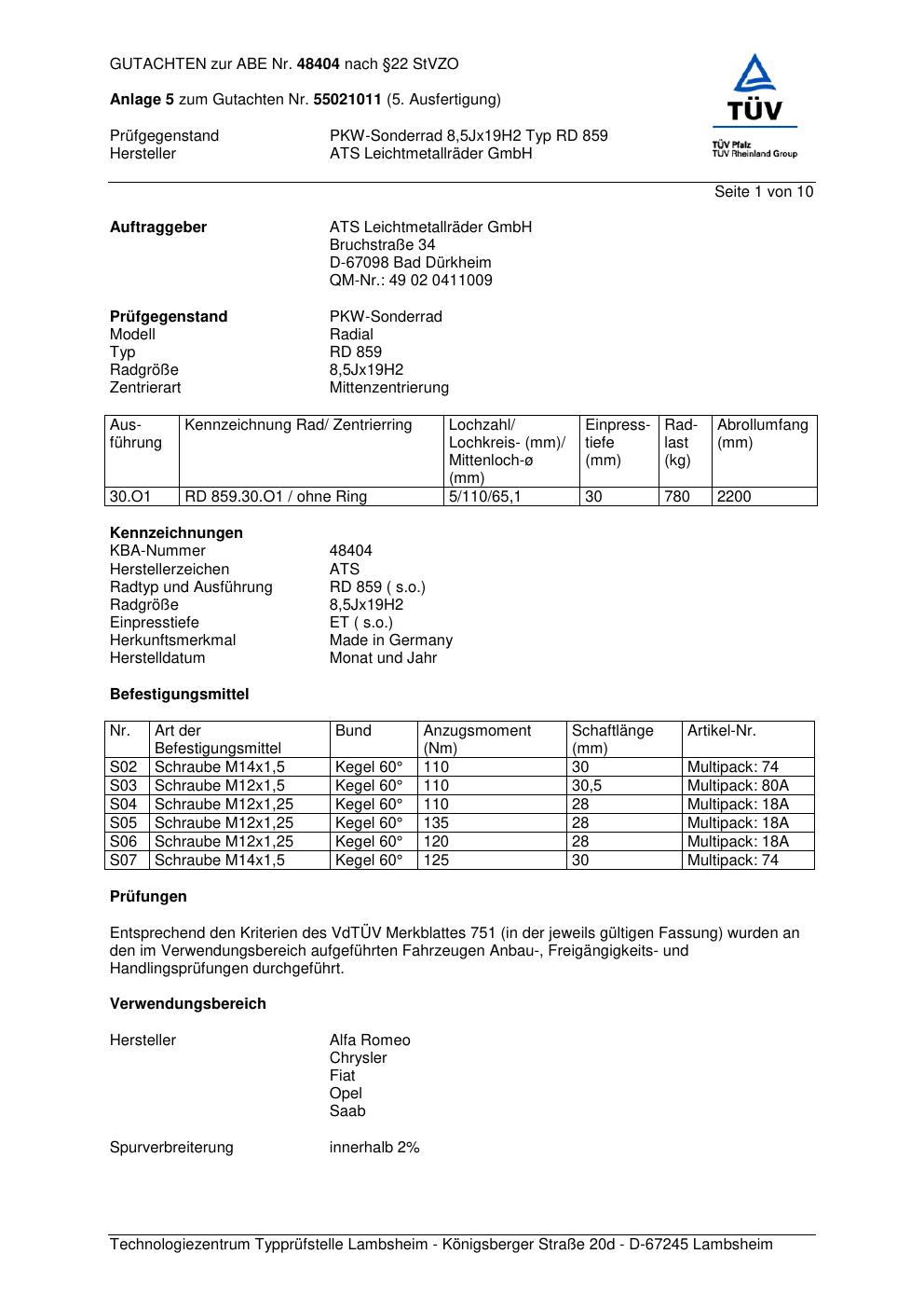 Dieses Gutachten (abe) bezieht sich auf die Alufelge ATS RD 859 in der Ausführung 8.5Jx19 ET 0, Mittenloch 0 mm (KBA 48404). Im PDF findest du typischerweise zulässige Reifengrößen, Auflagen/Anbauhinweise und – je nach Dokument – Hinweise zur Eintragung.
