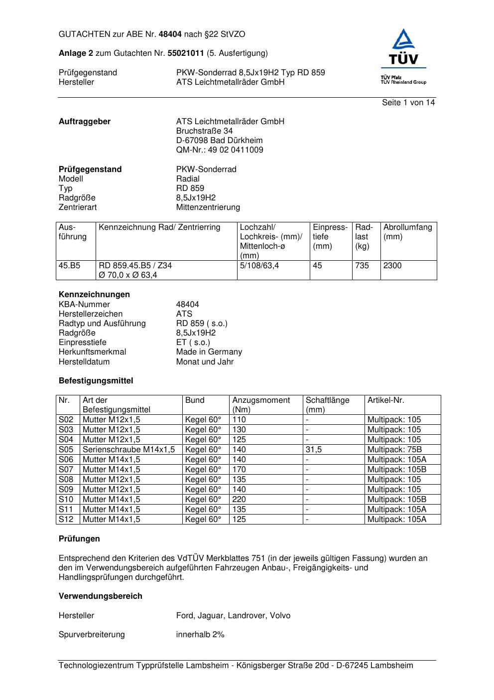 Dieses Gutachten (abe) bezieht sich auf die Alufelge ATS RD 859 in der Ausführung 8.5Jx19 ET 0, Mittenloch 0 mm (KBA 48404). Im PDF findest du typischerweise zulässige Reifengrößen, Auflagen/Anbauhinweise und – je nach Dokument – Hinweise zur Eintragung.