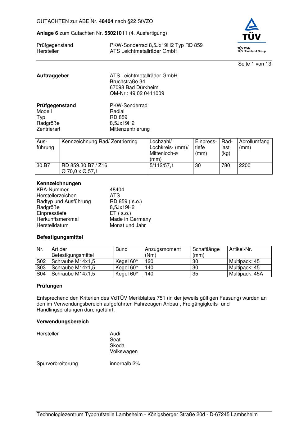Dieses Gutachten (abe) bezieht sich auf die Alufelge ATS RD 859 in der Ausführung 8.5Jx19 ET 0, Mittenloch 0 mm (KBA 48404). Im PDF findest du typischerweise zulässige Reifengrößen, Auflagen/Anbauhinweise und – je nach Dokument – Hinweise zur Eintragung.