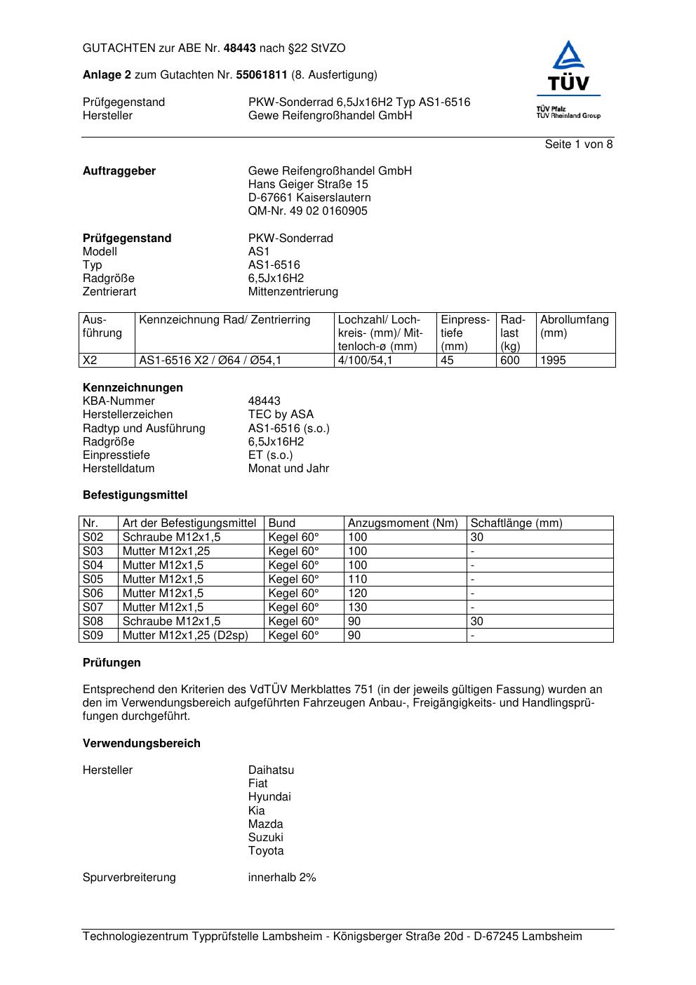 Dieses Gutachten (abe) bezieht sich auf die Alufelge ATS AS1-6516 in der Ausführung 6.5Jx16 ET 0, Mittenloch 0 mm (KBA 48443). Im PDF findest du typischerweise zulässige Reifengrößen, Auflagen/Anbauhinweise und – je nach Dokument – Hinweise zur Eintragung.