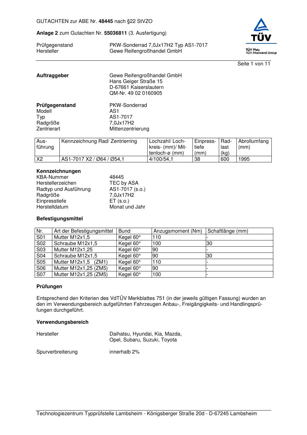 Dieses Gutachten (abe) bezieht sich auf die Alufelge ATS AS1-7017 in der Ausführung 7Jx17 ET 0, Mittenloch 0 mm (KBA 48445). Im PDF findest du typischerweise zulässige Reifengrößen, Auflagen/Anbauhinweise und – je nach Dokument – Hinweise zur Eintragung.