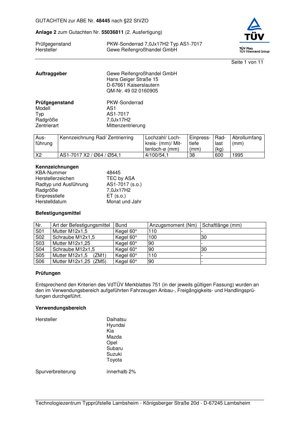 Dieses Gutachten (abe) bezieht sich auf die Alufelge ATS AS1-7017 in der Ausführung 7Jx17 ET 0, Mittenloch 0 mm (KBA 48445). Im PDF findest du typischerweise zulässige Reifengrößen, Auflagen/Anbauhinweise und – je nach Dokument – Hinweise zur Eintragung.