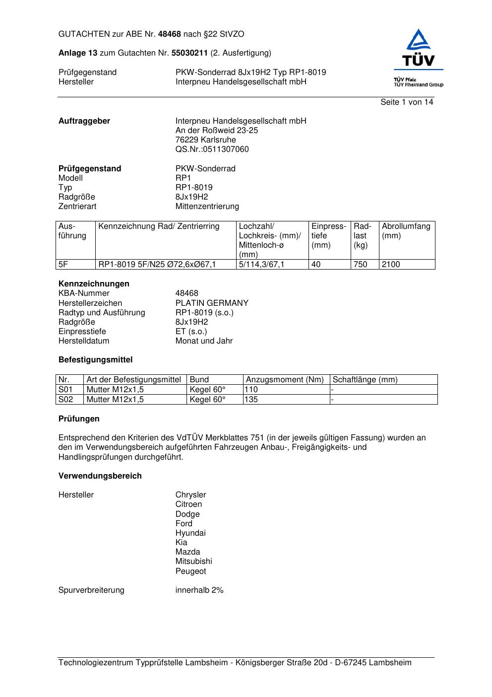 Dieses Gutachten (abe) bezieht sich auf die Alufelge Platin RP1-8019 in der Ausführung 8Jx19 ET 0, Mittenloch 0 mm (KBA 48468). Im PDF findest du typischerweise zulässige Reifengrößen, Auflagen/Anbauhinweise und – je nach Dokument – Hinweise zur Eintragung.