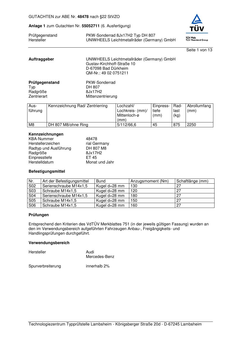 Dieses Gutachten (abe) bezieht sich auf die Alufelge brand-rial DH 807 in der Ausführung 8Jx17 ET 0, Mittenloch 0 mm (KBA 48478). Im PDF findest du typischerweise zulässige Reifengrößen, Auflagen/Anbauhinweise und – je nach Dokument – Hinweise zur Eintragung.