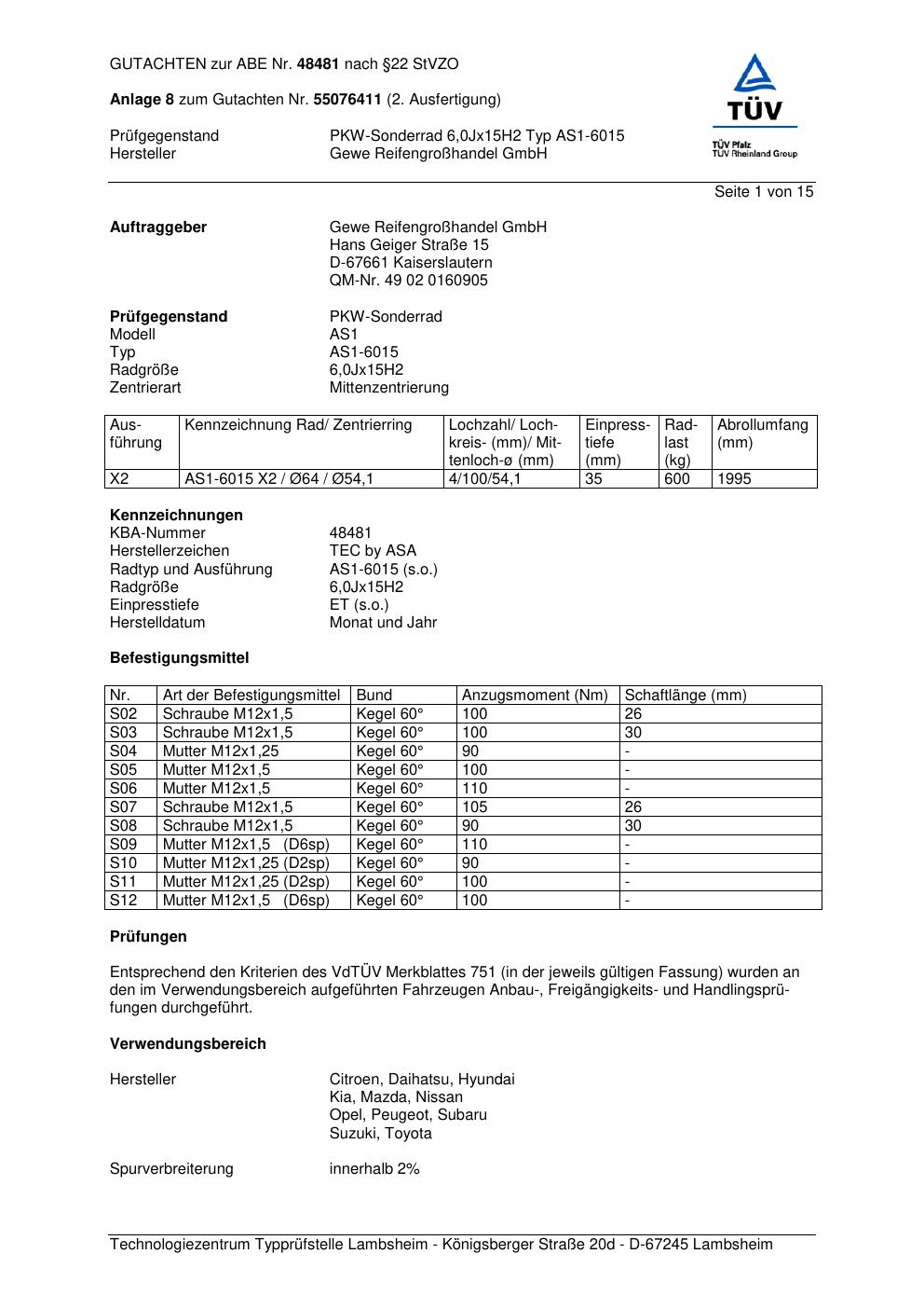 Dieses Gutachten (abe) bezieht sich auf die Alufelge ATS AS1-6015 in der Ausführung 6Jx15 ET 0, Mittenloch 0 mm (KBA 48481). Im PDF findest du typischerweise zulässige Reifengrößen, Auflagen/Anbauhinweise und – je nach Dokument – Hinweise zur Eintragung.