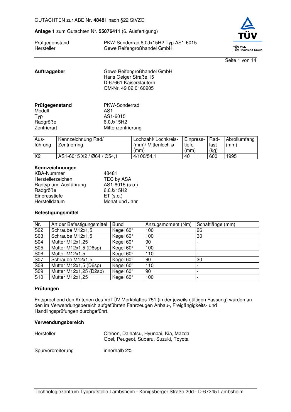 Dieses Gutachten (abe) bezieht sich auf die Alufelge ATS AS1-6015 in der Ausführung 6Jx15 ET 0, Mittenloch 0 mm (KBA 48481). Im PDF findest du typischerweise zulässige Reifengrößen, Auflagen/Anbauhinweise und – je nach Dokument – Hinweise zur Eintragung.