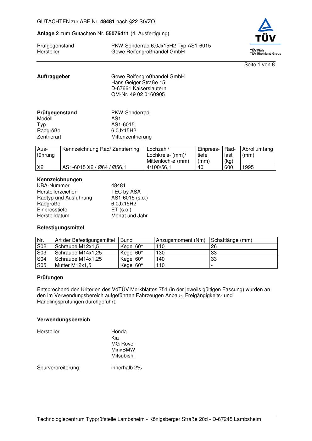 Dieses Gutachten (abe) bezieht sich auf die Alufelge co-rod AS1-6015 in der Ausführung 6Jx15 ET 0, Mittenloch 0 mm (KBA 48481). Im PDF findest du typischerweise zulässige Reifengrößen, Auflagen/Anbauhinweise und – je nach Dokument – Hinweise zur Eintragung.