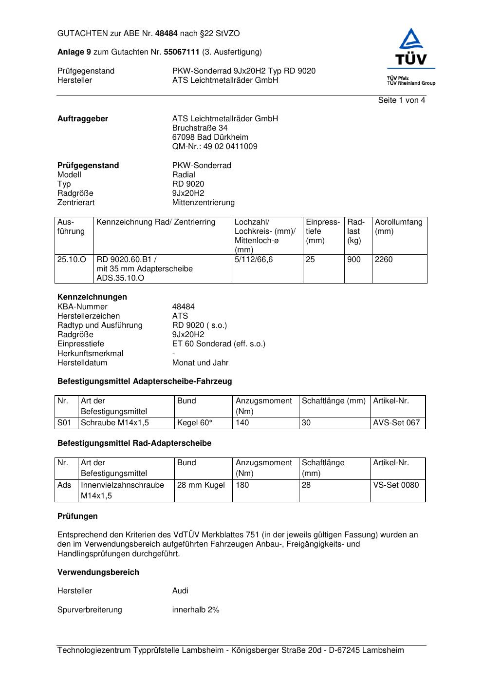 Dieses Gutachten (abe) bezieht sich auf die Alufelge ATS RD 9020 in der Ausführung 9Jx2 ET 0, Mittenloch 0 mm (KBA 48484). Im PDF findest du typischerweise zulässige Reifengrößen, Auflagen/Anbauhinweise und – je nach Dokument – Hinweise zur Eintragung.