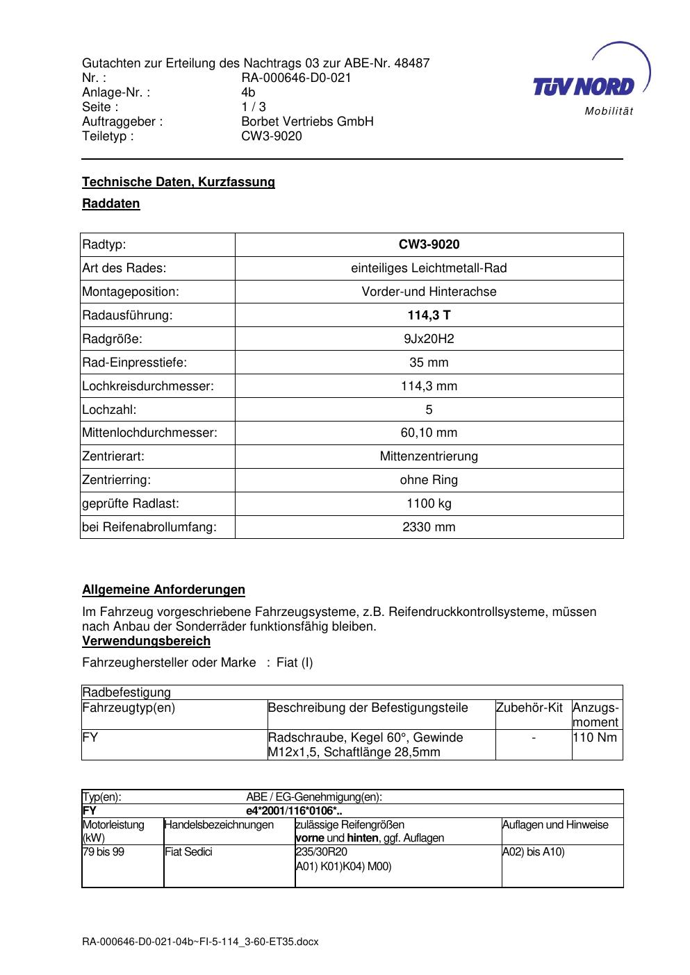Dieses Gutachten (abe) bezieht sich auf die Alufelge brand-borbet CW3 -9020 in der Ausführung 9Jx2 ET 0, Mittenloch 0 mm (KBA 48487). Im PDF findest du typischerweise zulässige Reifengrößen, Auflagen/Anbauhinweise und – je nach Dokument – Hinweise zur Eintragung.