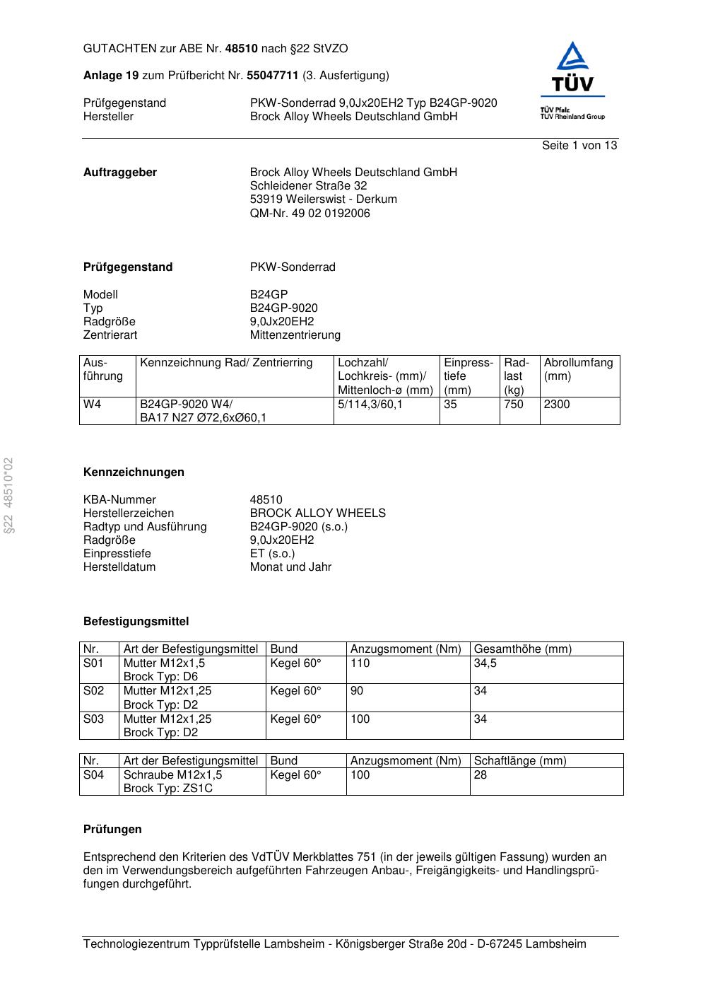 Dieses Gutachten (abe) bezieht sich auf die Alufelge Brock B24GP-9 020 in der Ausführung ET 0, Mittenloch 0 mm (KBA 48510). Im PDF findest du typischerweise zulässige Reifengrößen, Auflagen/Anbauhinweise und – je nach Dokument – Hinweise zur Eintragung.