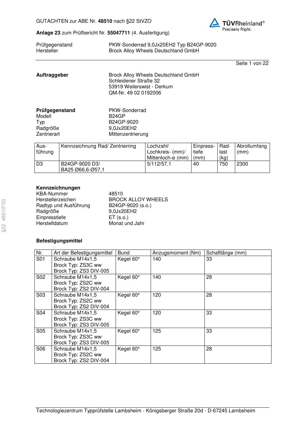 Dieses Gutachten (abe) bezieht sich auf die Alufelge Brock B24GP-9 020 in der Ausführung 8.5Jx19 ET 0, Mittenloch 0 mm (KBA 48510). Im PDF findest du typischerweise zulässige Reifengrößen, Auflagen/Anbauhinweise und – je nach Dokument – Hinweise zur Eintragung.
