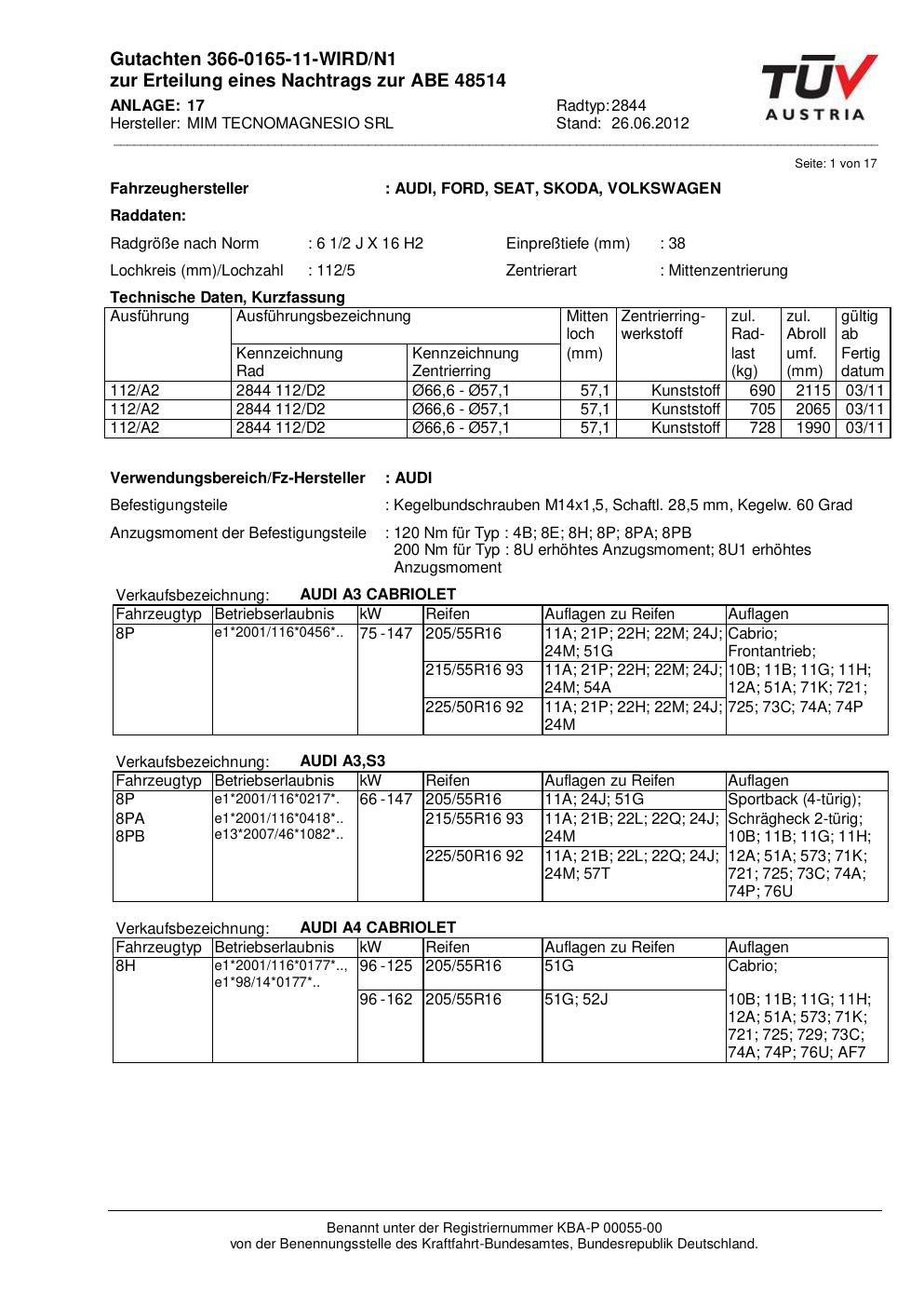 Die vollständige und rechtsverbindliche Fahrzeugliste mit allen Auflagen und Einschränkungen steht im PDF-Dokument. Nicht jede Fahrzeug-Kombination erlaubt alle Reifengrößen oder Tieferlegungen – die Details entscheiden bei der Abnahme.