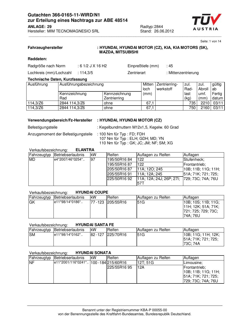 Dieses abe führt 5 Fahrzeugvarianten von 5 Fahrzeugherstellern als zulässig auf. Abgedeckt werden insbesondere Fahrzeuge von HYUNDAI, KIA, MAZDA, MG, MITSUBISHI. Prüfe in der folgenden Liste, ob dein konkretes Fahrzeugmodell und – soweit angegeben – der passende Typ-Code (HSN/TSN-Variante) dabei ist. Der Typ-Code steht im Fahrzeugschein unter den Ziffern 2.1 und 2.2.