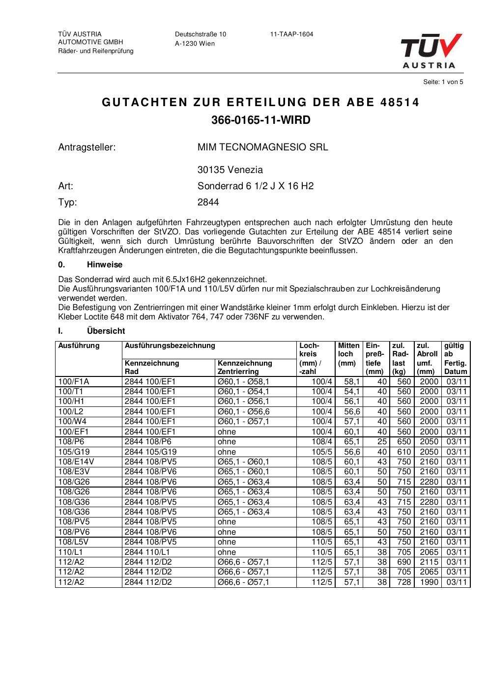 Diese Allgemeine Betriebserlaubnis (ABE) bezieht sich auf die Felge ATS 2844 in der Ausführung 2Jx16 ET0 mit der KBA 48514. Eine ABE ist eine bauartspezifische Genehmigung, die der Hersteller beim Kraftfahrt-Bundesamt (KBA) erwirkt hat. Sie erlaubt die Verwendung der Felge an den im Dokument genannten Fahrzeugen ohne zusätzliche Einzelabnahme, solange sämtliche im Gutachten aufgeführten Auflagen eingehalten werden.