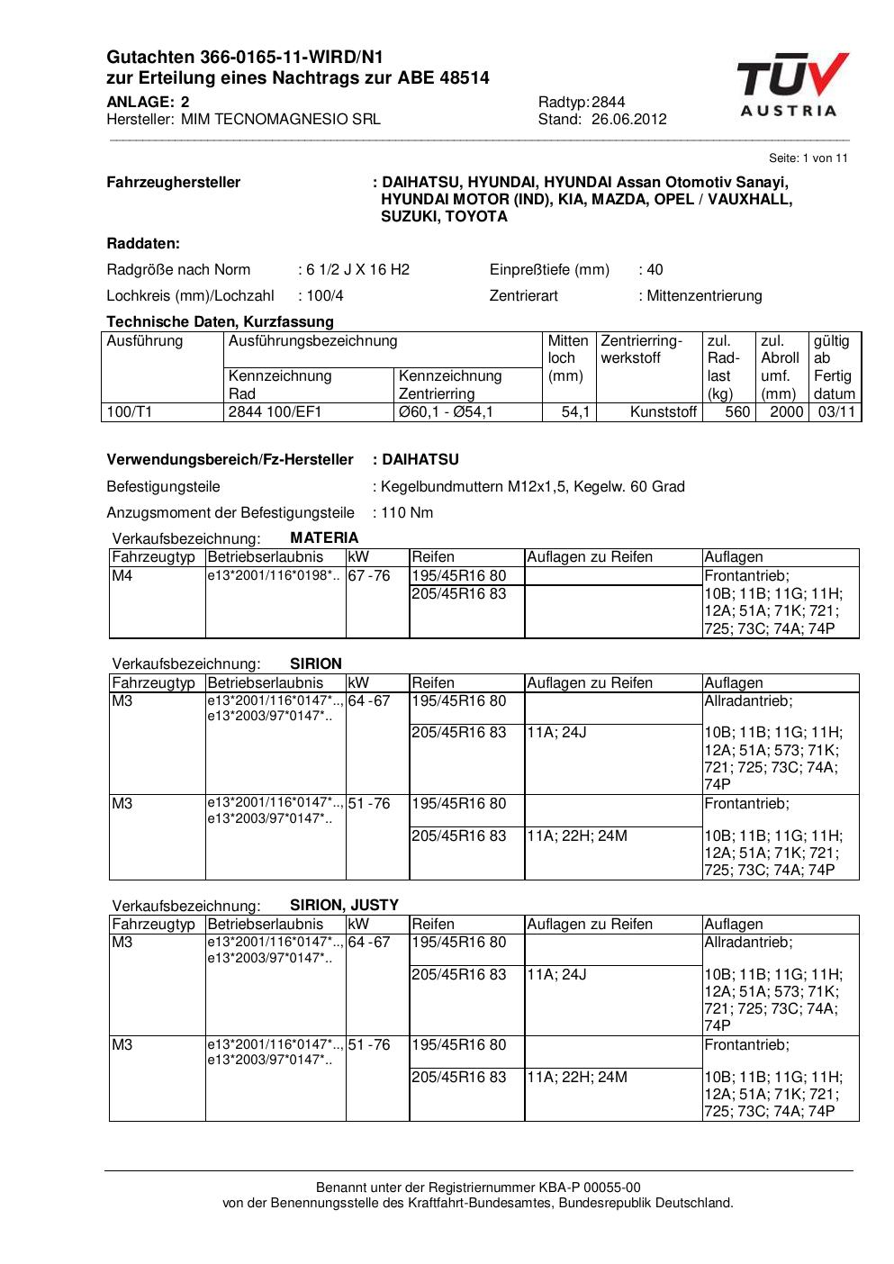 Diese Allgemeine Betriebserlaubnis (ABE) bezieht sich auf die Felge ATS 2844 in der Ausführung 2Jx16 ET0 mit der KBA 48514. Eine ABE ist eine bauartspezifische Genehmigung, die der Hersteller beim Kraftfahrt-Bundesamt (KBA) erwirkt hat. Sie erlaubt die Verwendung der Felge an den im Dokument genannten Fahrzeugen ohne zusätzliche Einzelabnahme, solange sämtliche im Gutachten aufgeführten Auflagen eingehalten werden.