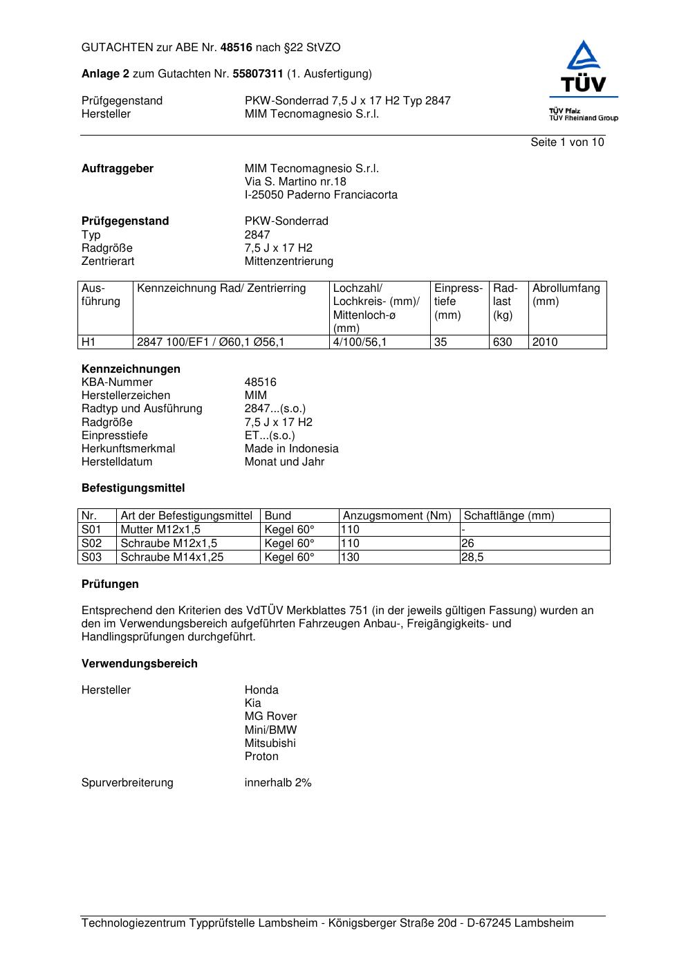 Dieses Gutachten (abe) bezieht sich auf die Alufelge co-rod 2847 in der Ausführung 7.5Jx17 ET 0, Mittenloch 0 mm (KBA 48516). Im PDF findest du typischerweise zulässige Reifengrößen, Auflagen/Anbauhinweise und – je nach Dokument – Hinweise zur Eintragung.