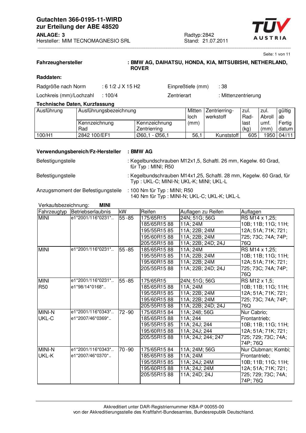 Dieses abe führt 8 Fahrzeugvarianten von 8 Fahrzeugherstellern als zulässig auf. Abgedeckt werden insbesondere Fahrzeuge von BMW, DAIHATSU, HONDA, KIA, MINI, MITSUBISHI, NETHERLAND, ROVER. Prüfe in der folgenden Liste, ob dein konkretes Fahrzeugmodell und – soweit angegeben – der passende Typ-Code (HSN/TSN-Variante) dabei ist. Der Typ-Code steht im Fahrzeugschein unter den Ziffern 2.1 und 2.2.