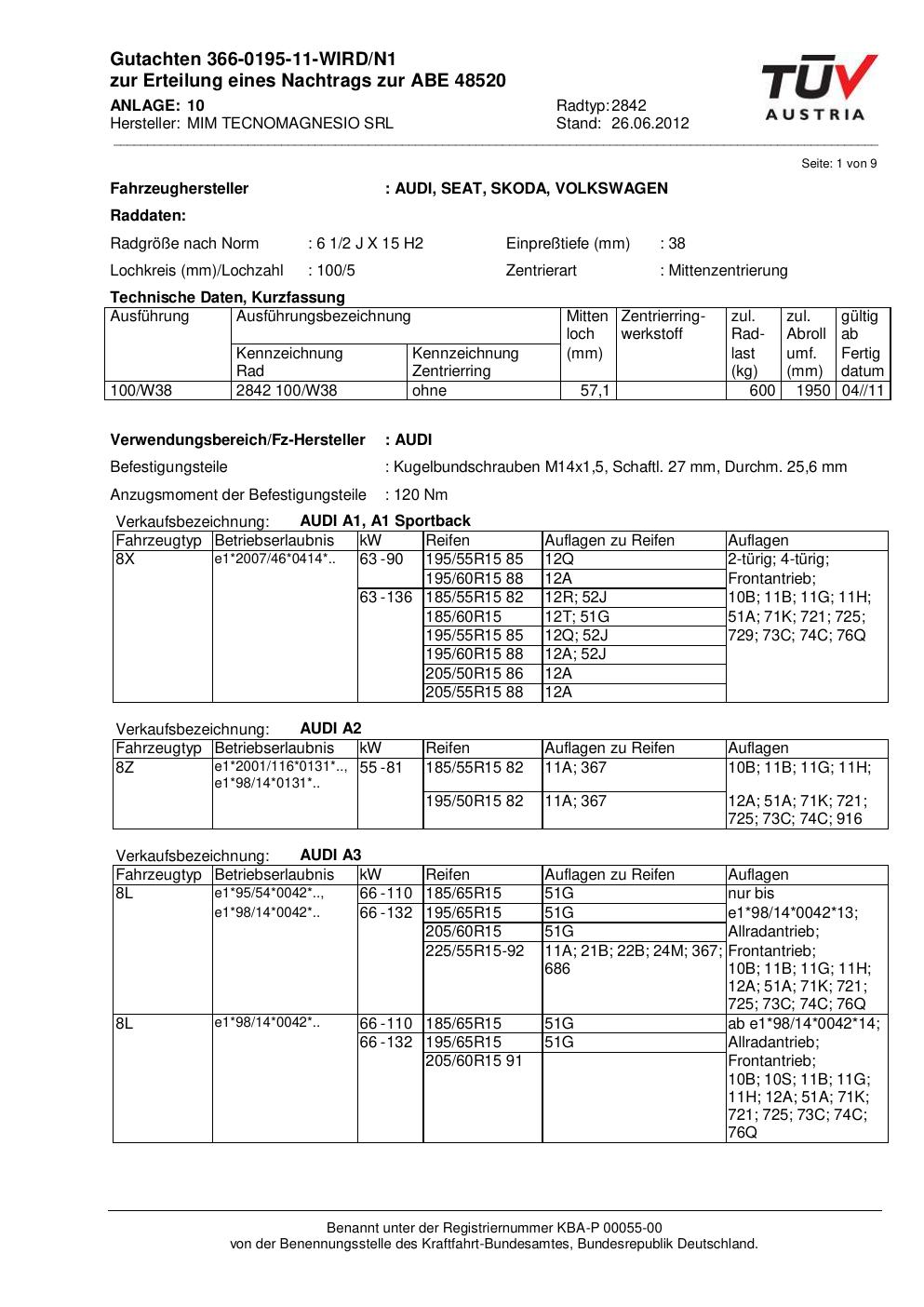 Diese Allgemeine Betriebserlaubnis (ABE) bezieht sich auf die Felge ATS 2842 in der Ausführung 2Jx15 ET0 mit der KBA 48520. Eine ABE ist eine bauartspezifische Genehmigung, die der Hersteller beim Kraftfahrt-Bundesamt (KBA) erwirkt hat. Sie erlaubt die Verwendung der Felge an den im Dokument genannten Fahrzeugen ohne zusätzliche Einzelabnahme, solange sämtliche im Gutachten aufgeführten Auflagen eingehalten werden.