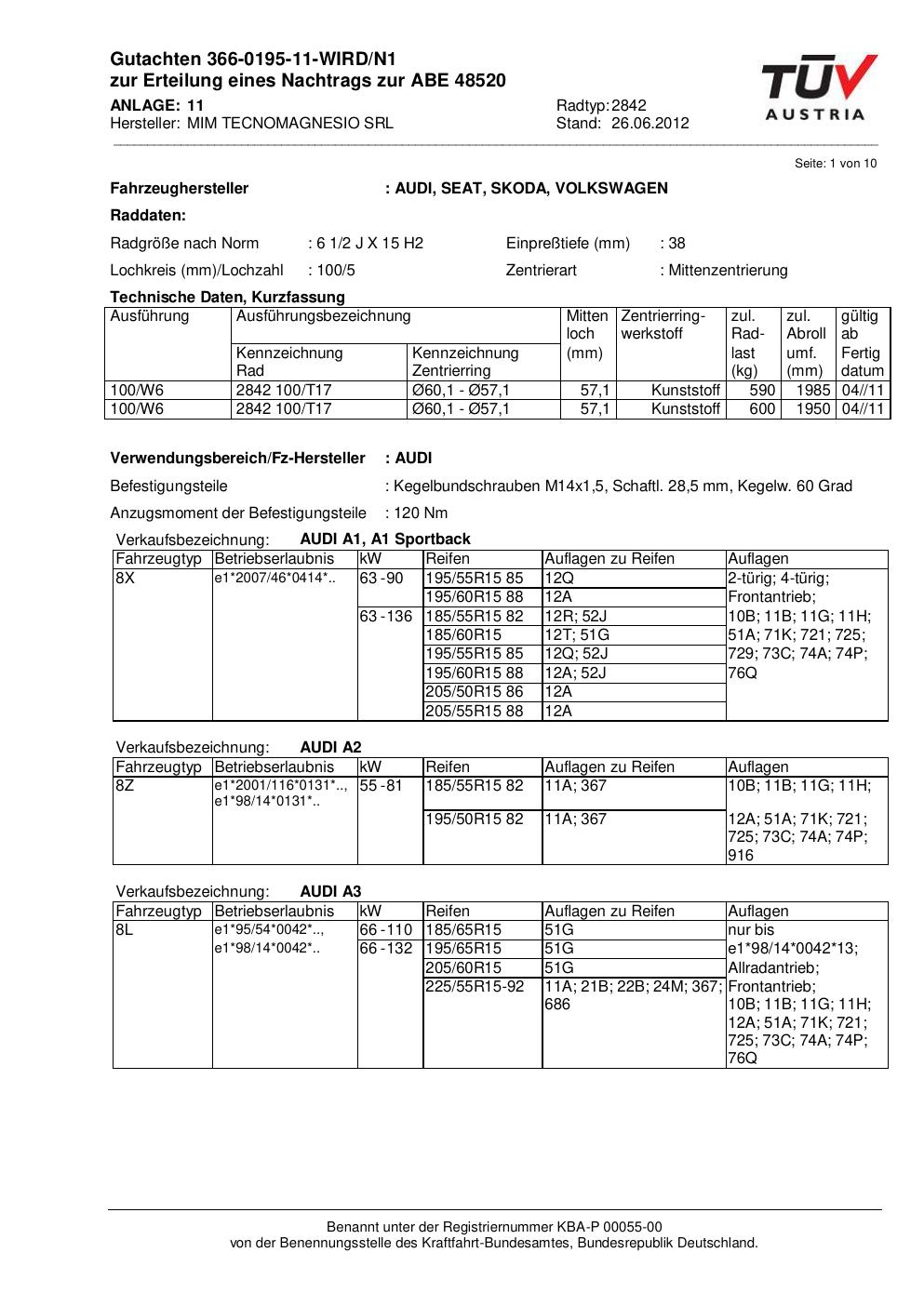 Diese Allgemeine Betriebserlaubnis (ABE) bezieht sich auf die Felge ATS 2842 in der Ausführung 2Jx15 ET0 mit der KBA 48520. Eine ABE ist eine bauartspezifische Genehmigung, die der Hersteller beim Kraftfahrt-Bundesamt (KBA) erwirkt hat. Sie erlaubt die Verwendung der Felge an den im Dokument genannten Fahrzeugen ohne zusätzliche Einzelabnahme, solange sämtliche im Gutachten aufgeführten Auflagen eingehalten werden.