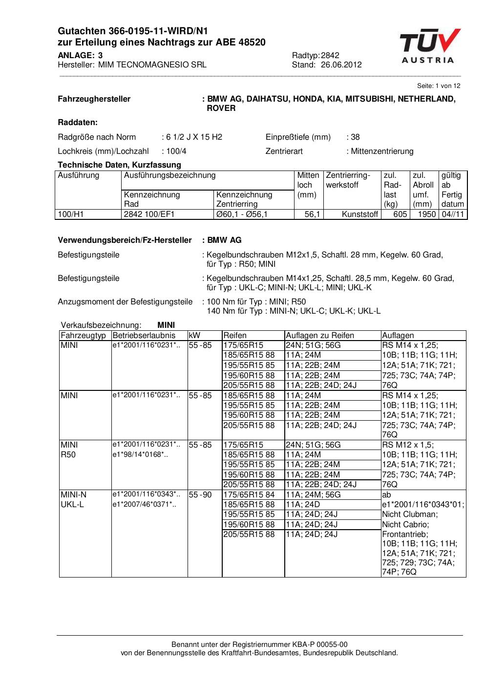 Dieses abe führt 8 Fahrzeugvarianten von 8 Fahrzeugherstellern als zulässig auf. Abgedeckt werden insbesondere Fahrzeuge von BMW, DAIHATSU, HONDA, KIA, MINI, MITSUBISHI, NETHERLAND, ROVER. Prüfe in der folgenden Liste, ob dein konkretes Fahrzeugmodell und – soweit angegeben – der passende Typ-Code (HSN/TSN-Variante) dabei ist. Der Typ-Code steht im Fahrzeugschein unter den Ziffern 2.1 und 2.2.
