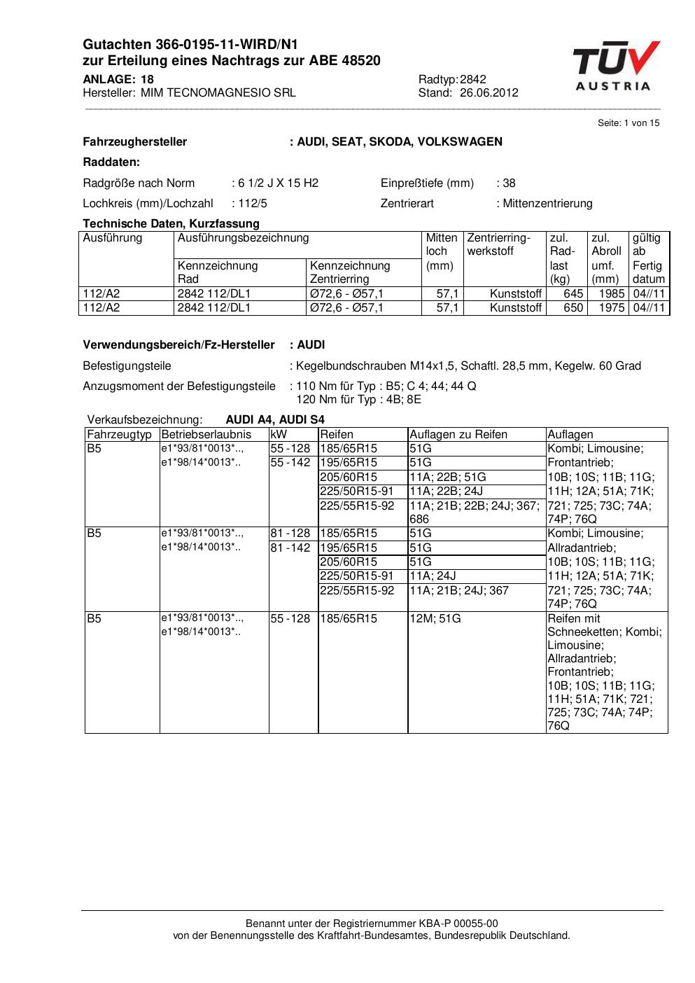 Diese Allgemeine Betriebserlaubnis (ABE) bezieht sich auf die Felge ATS 2842 in der Ausführung 2Jx15 ET0 mit der KBA 48520. Eine ABE ist eine bauartspezifische Genehmigung, die der Hersteller beim Kraftfahrt-Bundesamt (KBA) erwirkt hat. Sie erlaubt die Verwendung der Felge an den im Dokument genannten Fahrzeugen ohne zusätzliche Einzelabnahme, solange sämtliche im Gutachten aufgeführten Auflagen eingehalten werden.