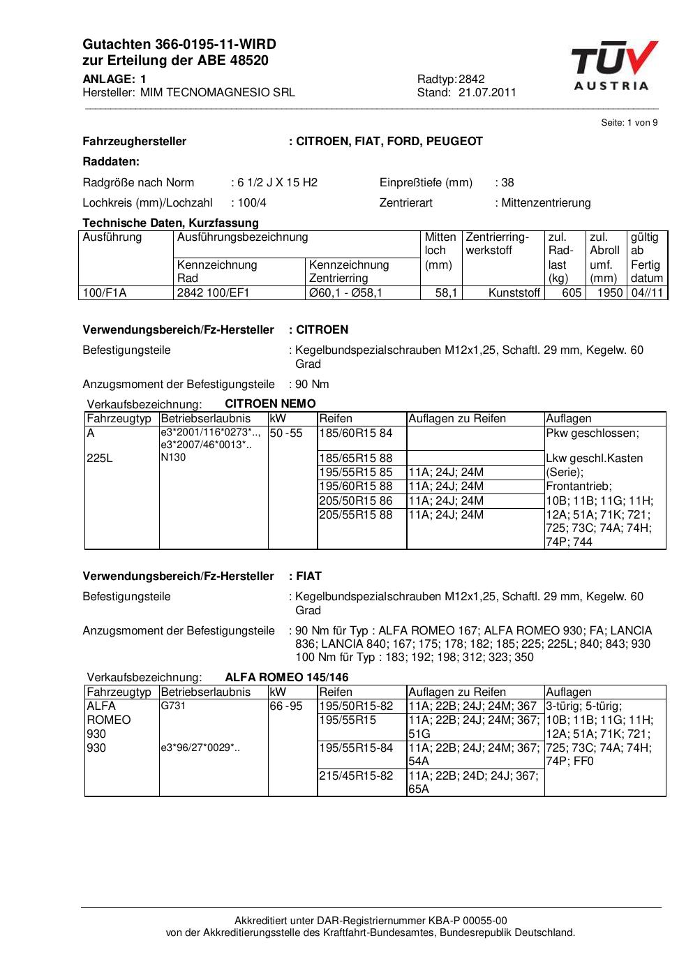Dieses abe führt 6 Fahrzeugvarianten von 6 Fahrzeugherstellern als zulässig auf. Abgedeckt werden insbesondere Fahrzeuge von ALFA ROMEO, CITROEN, FIAT, FORD, LANCIA, PEUGEOT. Prüfe in der folgenden Liste, ob dein konkretes Fahrzeugmodell und – soweit angegeben – der passende Typ-Code (HSN/TSN-Variante) dabei ist. Der Typ-Code steht im Fahrzeugschein unter den Ziffern 2.1 und 2.2.
