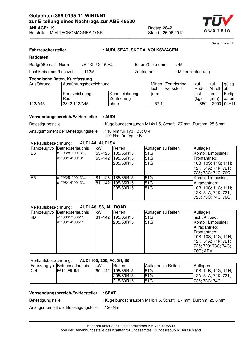 Diese Allgemeine Betriebserlaubnis (ABE) bezieht sich auf die Felge ATS 2842 in der Ausführung 2Jx15 ET0 mit der KBA 48520. Eine ABE ist eine bauartspezifische Genehmigung, die der Hersteller beim Kraftfahrt-Bundesamt (KBA) erwirkt hat. Sie erlaubt die Verwendung der Felge an den im Dokument genannten Fahrzeugen ohne zusätzliche Einzelabnahme, solange sämtliche im Gutachten aufgeführten Auflagen eingehalten werden.