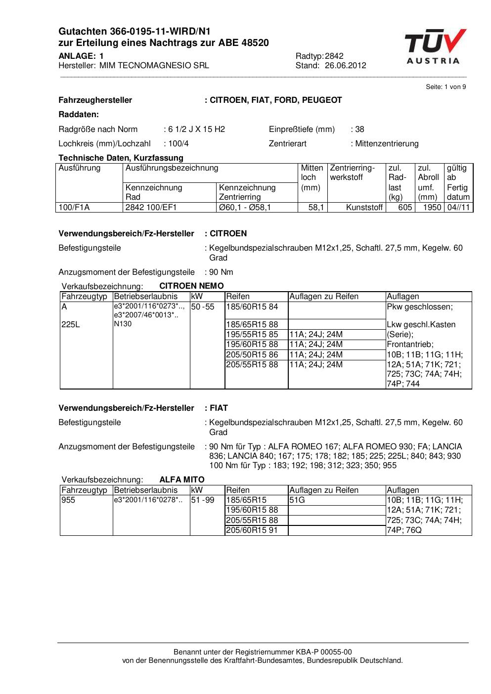Dieses abe führt 6 Fahrzeugvarianten von 6 Fahrzeugherstellern als zulässig auf. Abgedeckt werden insbesondere Fahrzeuge von ALFA ROMEO, CITROEN, FIAT, FORD, LANCIA, PEUGEOT. Prüfe in der folgenden Liste, ob dein konkretes Fahrzeugmodell und – soweit angegeben – der passende Typ-Code (HSN/TSN-Variante) dabei ist. Der Typ-Code steht im Fahrzeugschein unter den Ziffern 2.1 und 2.2.