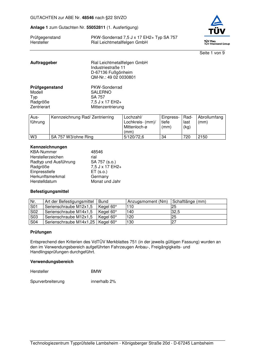 Dieses Gutachten (abe) bezieht sich auf die Alufelge brand-rial SA 757 in der Ausführung 7.5Jx17 ET 0, Mittenloch 0 mm (KBA 48546). Im PDF findest du typischerweise zulässige Reifengrößen, Auflagen/Anbauhinweise und – je nach Dokument – Hinweise zur Eintragung.