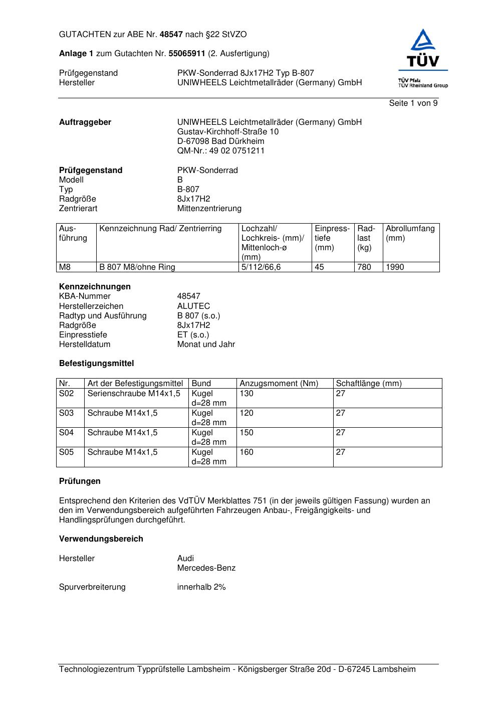 Dieses Gutachten (abe) bezieht sich auf die Alufelge ALUTEC B-807 in der Ausführung 8Jx17 ET 0, Mittenloch 0 mm (KBA 48547). Im PDF findest du typischerweise zulässige Reifengrößen, Auflagen/Anbauhinweise und – je nach Dokument – Hinweise zur Eintragung.