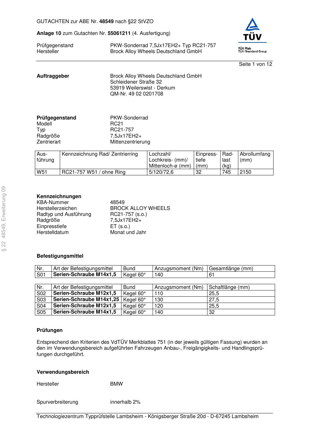 Dieses Gutachten (abe) bezieht sich auf die Alufelge Brock RC21-7 57 in der Ausführung ET 0, Mittenloch 0 mm (KBA 48549). Im PDF findest du typischerweise zulässige Reifengrößen, Auflagen/Anbauhinweise und – je nach Dokument – Hinweise zur Eintragung.