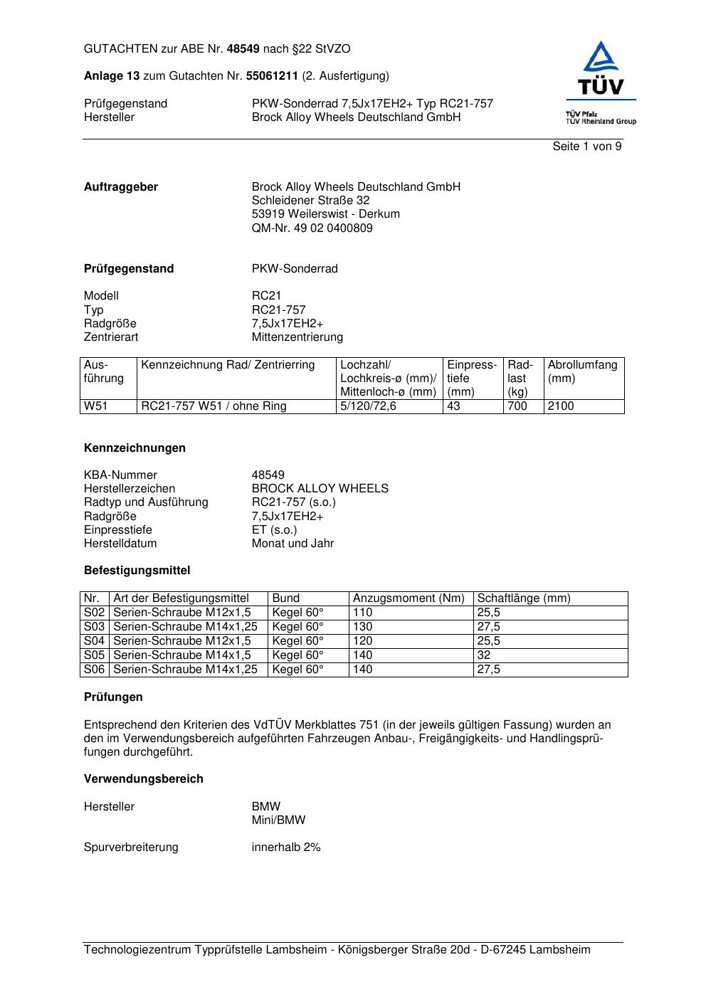 Dieses Gutachten (abe) bezieht sich auf die Alufelge Brock RC21-7 57 in der Ausführung 7.5Jx17 ET 0, Mittenloch 0 mm (KBA 48549). Im PDF findest du typischerweise zulässige Reifengrößen, Auflagen/Anbauhinweise und – je nach Dokument – Hinweise zur Eintragung.
