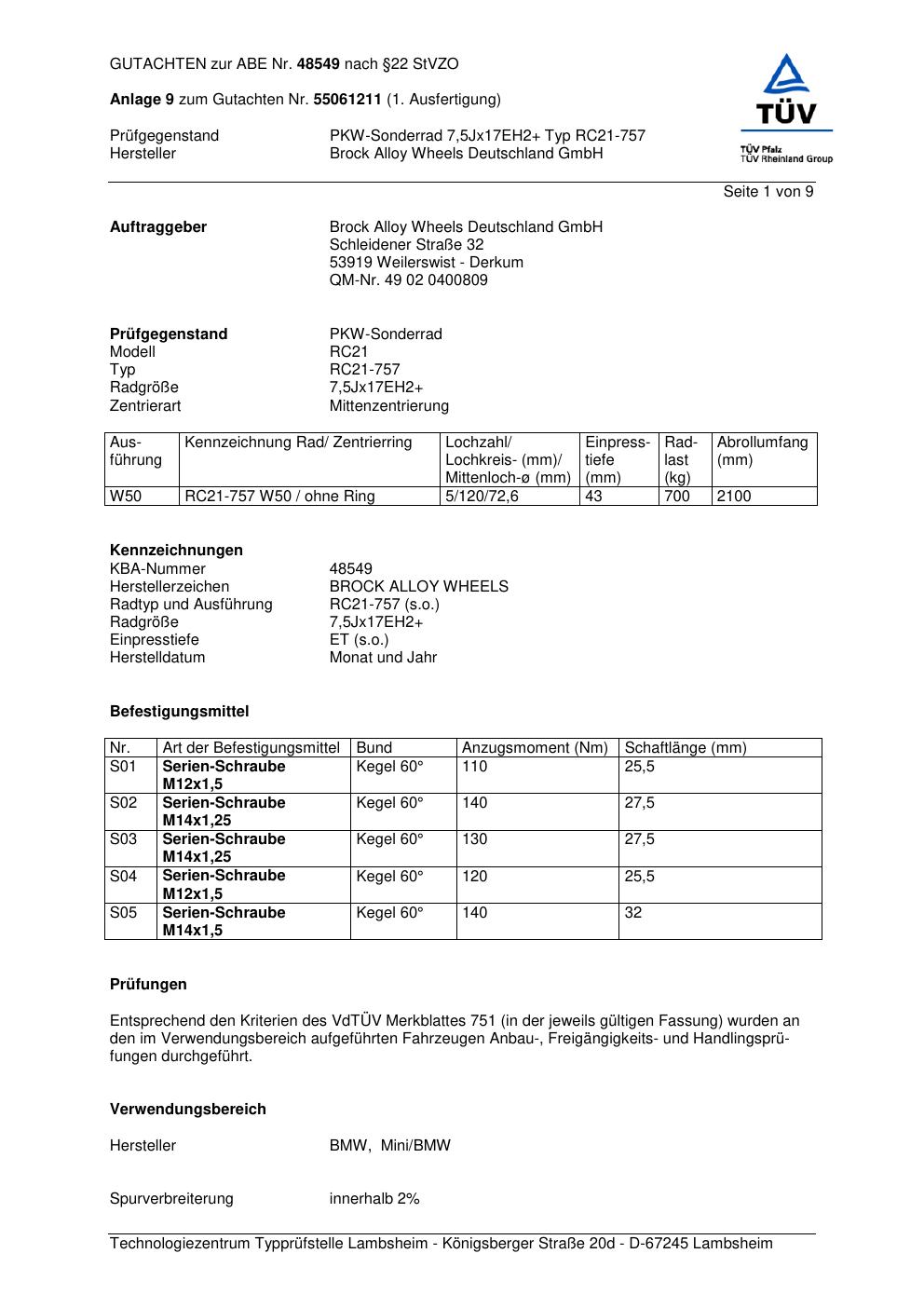 Dieses Gutachten (abe) bezieht sich auf die Alufelge Brock RC21-7 57 in der Ausführung ET 0, Mittenloch 0 mm (KBA 48549). Im PDF findest du typischerweise zulässige Reifengrößen, Auflagen/Anbauhinweise und – je nach Dokument – Hinweise zur Eintragung.