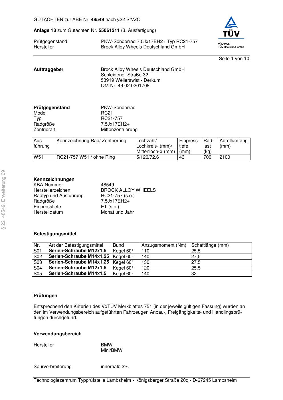 Dieses Gutachten (abe) bezieht sich auf die Alufelge Brock RC21-7 57 in der Ausführung ET 0, Mittenloch 0 mm (KBA 48549). Im PDF findest du typischerweise zulässige Reifengrößen, Auflagen/Anbauhinweise und – je nach Dokument – Hinweise zur Eintragung.
