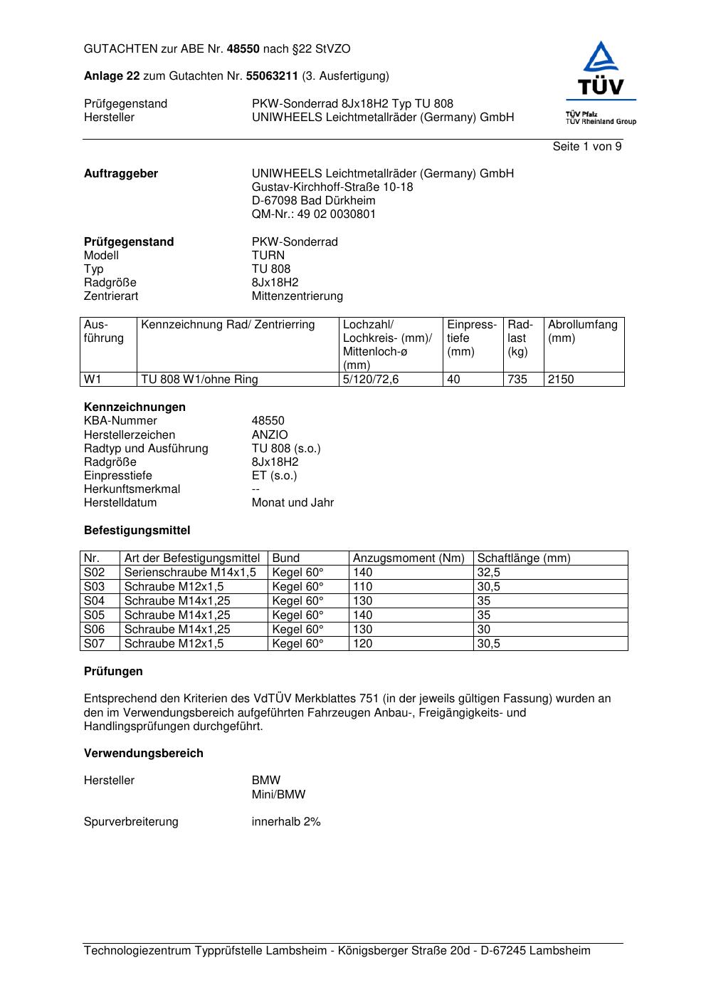 Dieses Gutachten (abe) bezieht sich auf die Alufelge brand-anzio TU 808 in der Ausführung 8Jx18 ET 0, Mittenloch 0 mm (KBA 48550). Im PDF findest du typischerweise zulässige Reifengrößen, Auflagen/Anbauhinweise und – je nach Dokument – Hinweise zur Eintragung.