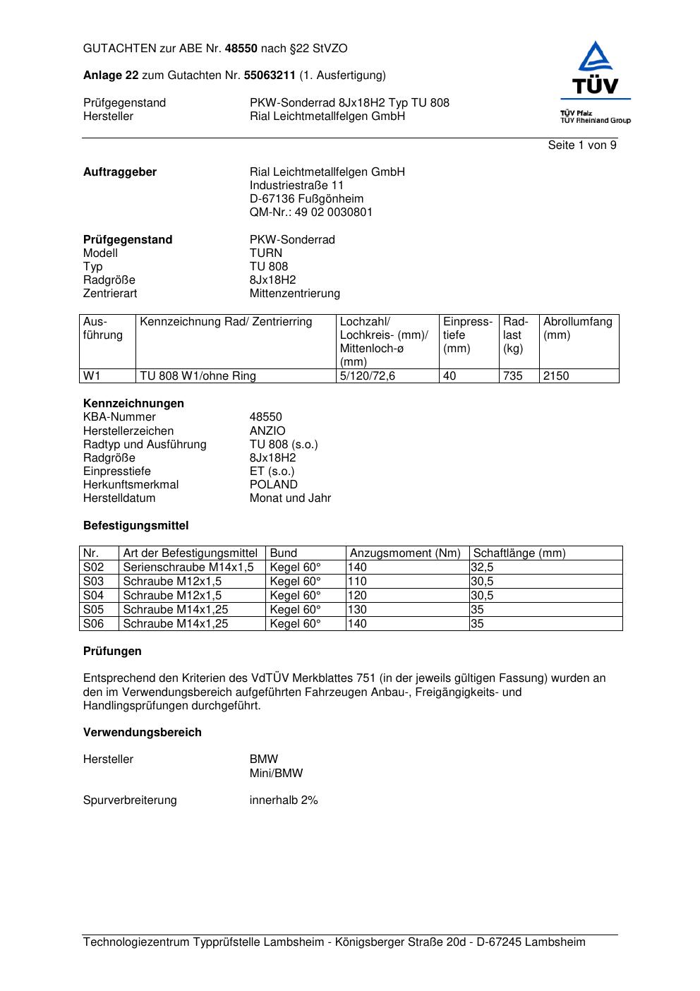 Dieses Gutachten (abe) bezieht sich auf die Alufelge brand-anzio TU 808 in der Ausführung 8Jx18 ET 0, Mittenloch 0 mm (KBA 48550). Im PDF findest du typischerweise zulässige Reifengrößen, Auflagen/Anbauhinweise und – je nach Dokument – Hinweise zur Eintragung.