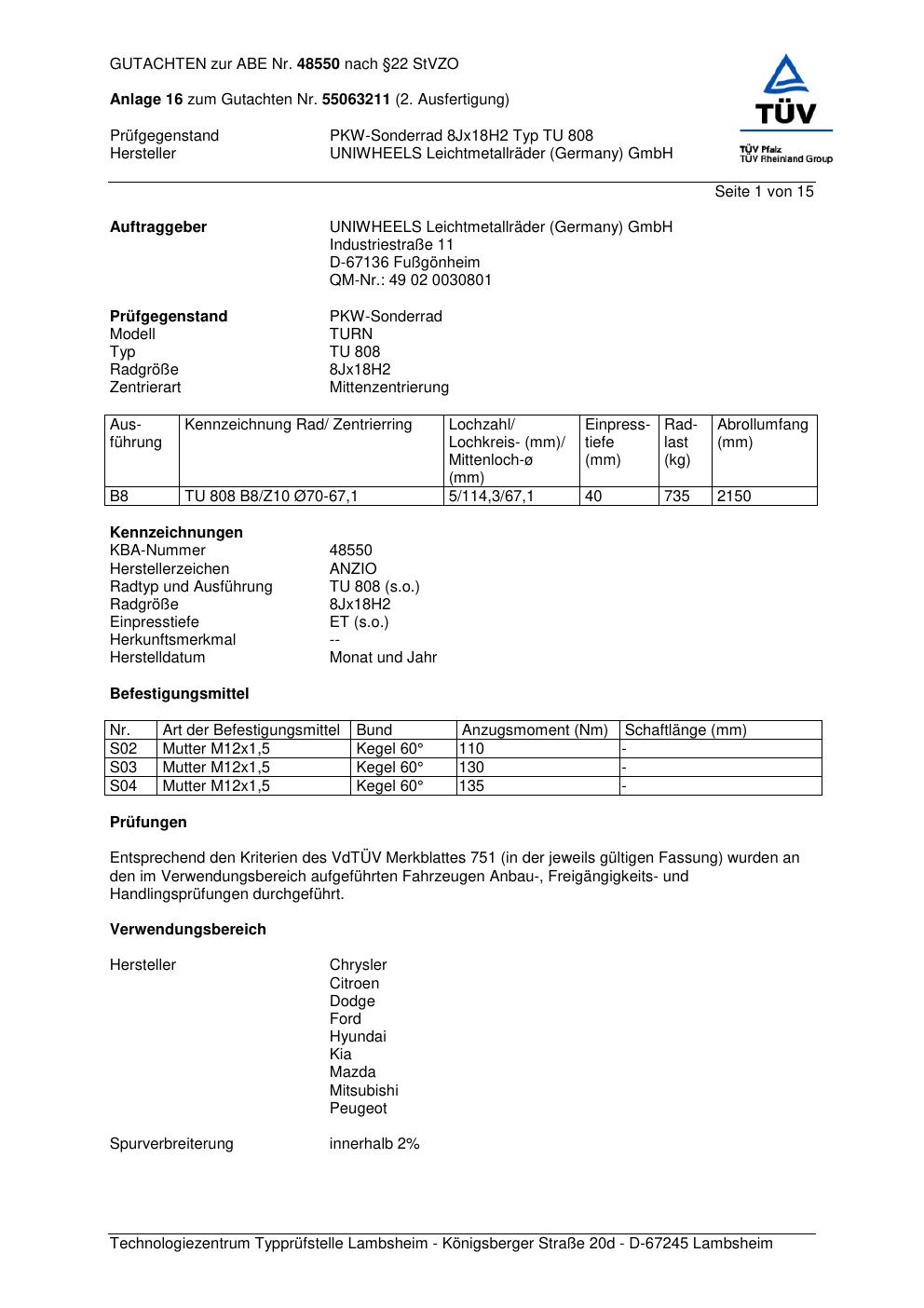 Dieses Gutachten (abe) bezieht sich auf die Alufelge brand-anzio TU 808 in der Ausführung 8Jx18 ET 0, Mittenloch 0 mm (KBA 48550). Im PDF findest du typischerweise zulässige Reifengrößen, Auflagen/Anbauhinweise und – je nach Dokument – Hinweise zur Eintragung.