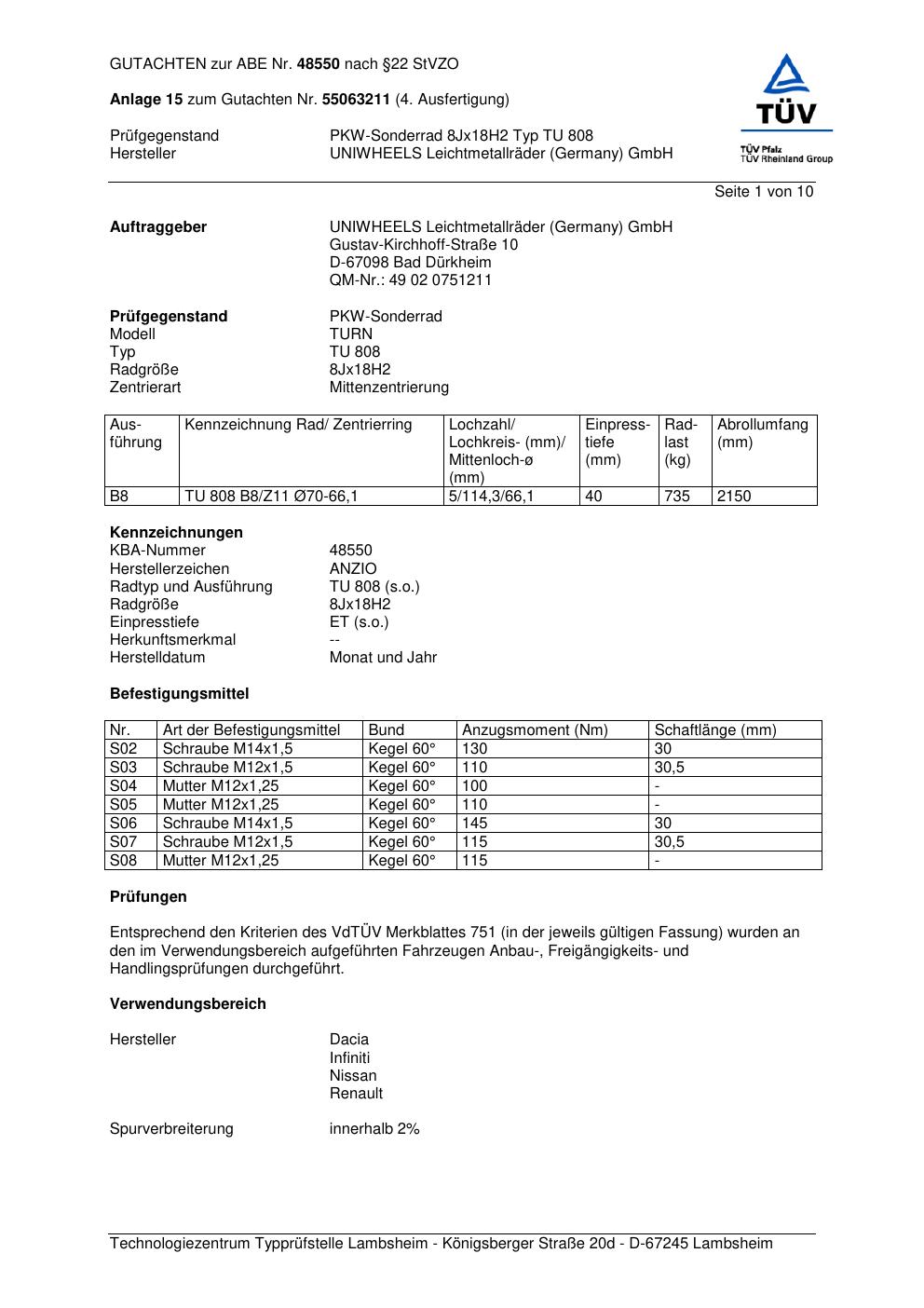 Dieses Gutachten (abe) bezieht sich auf die Alufelge brand-anzio TU 808 in der Ausführung 8Jx18 ET 0, Mittenloch 0 mm (KBA 48550). Im PDF findest du typischerweise zulässige Reifengrößen, Auflagen/Anbauhinweise und – je nach Dokument – Hinweise zur Eintragung.