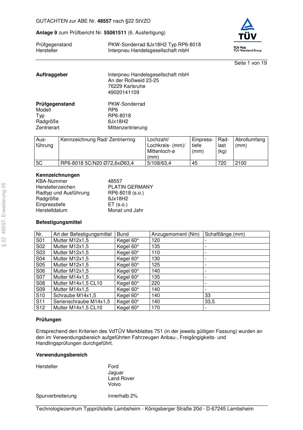 Felgengutachten / abe für Alufelgen Platin RP6-8018 (8Jx18 ET 0, Mittenloch 0 mm) mit KBA 48557 (Zertifikatsnummer 48557). Hier kostenlos als PDF herunterladen. Der Download-Link ist 24 Stunden gültig und kann bis zu zwei Mal verwendet werden.