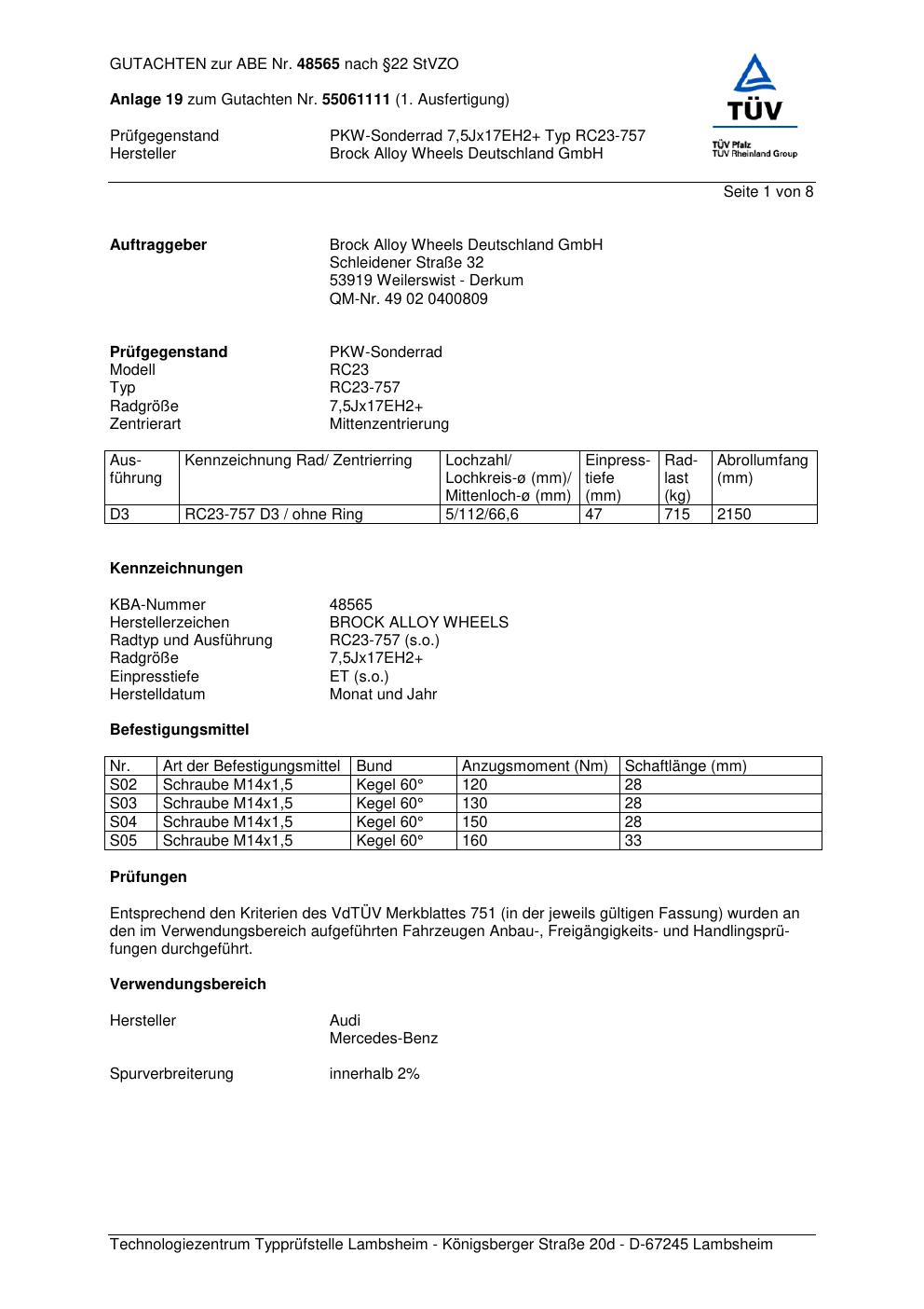 Dieses Gutachten (abe) bezieht sich auf die Alufelge Brock RC23-7 57 in der Ausführung 7.5Jx17 ET 0, Mittenloch 0 mm (KBA 48565). Im PDF findest du typischerweise zulässige Reifengrößen, Auflagen/Anbauhinweise und – je nach Dokument – Hinweise zur Eintragung.