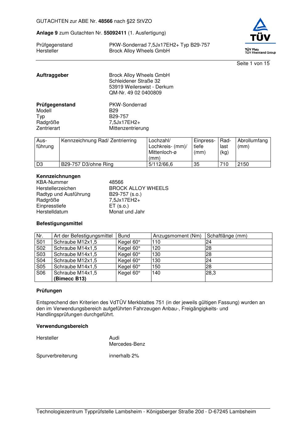 Dieses Gutachten (abe) bezieht sich auf die Alufelge Brock B29-75 7 in der Ausführung ET 0, Mittenloch 0 mm (KBA 48566). Im PDF findest du typischerweise zulässige Reifengrößen, Auflagen/Anbauhinweise und – je nach Dokument – Hinweise zur Eintragung.