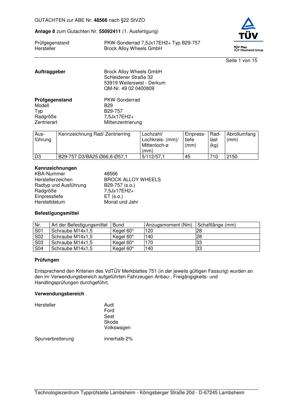 Felgengutachten / abe für Alufelgen Brock B29-75 7 (70Jx2 ET 0, Mittenloch 0 mm) mit KBA 48566 (Zertifikatsnummer 48566). Hier kostenlos als PDF herunterladen. Der Download-Link ist 24 Stunden gültig und kann bis zu zwei Mal verwendet werden.