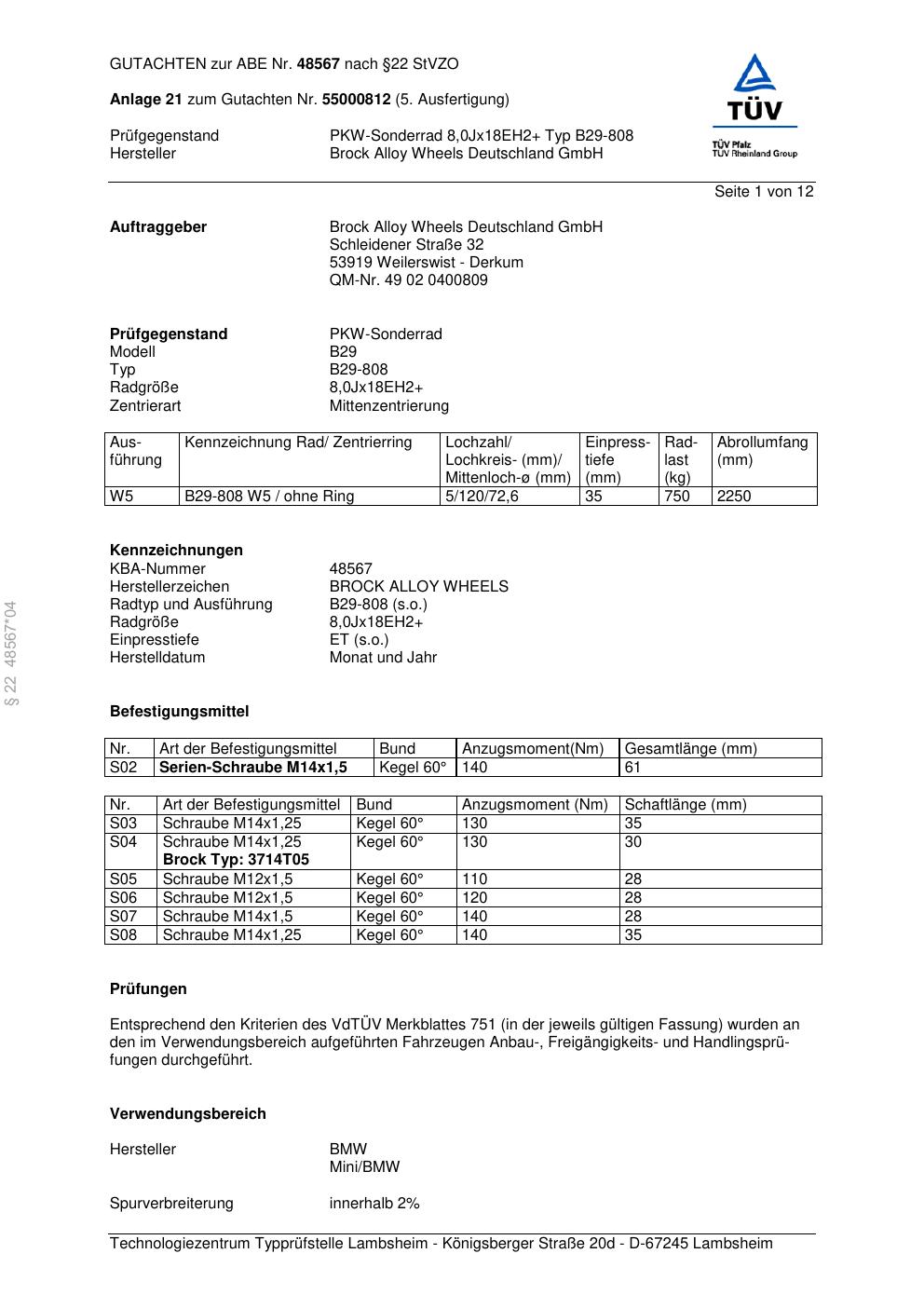 Dieses Gutachten (abe) bezieht sich auf die Alufelge Brock B29-80 8 in der Ausführung ET 0, Mittenloch 0 mm (KBA 48567). Im PDF findest du typischerweise zulässige Reifengrößen, Auflagen/Anbauhinweise und – je nach Dokument – Hinweise zur Eintragung.